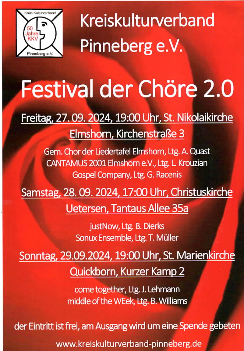 Am 27. September singt "The Gospel Company" in der St. Nikolaikirche Elmshorn bei dem "Festival der Chöre 2.0" organisiert von dem Kreiskulturverband Pinneberg e.V.
